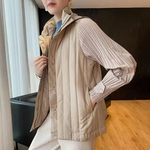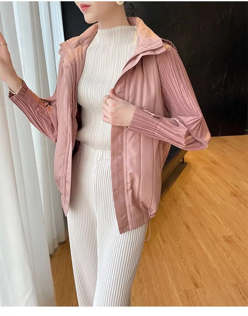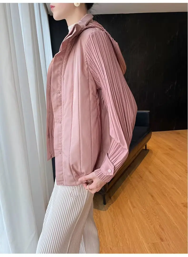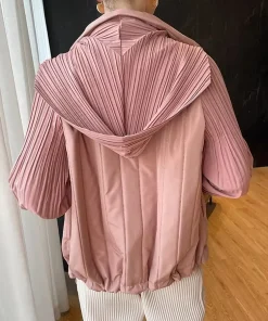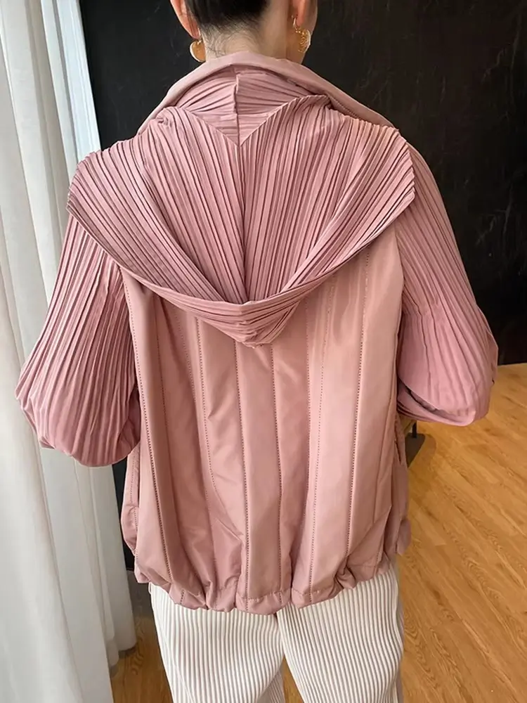 Elegant Pleated Hooded Zipper Solid Color Warm Versatile Full Sleeve Cotton Coat