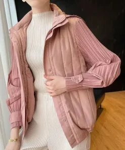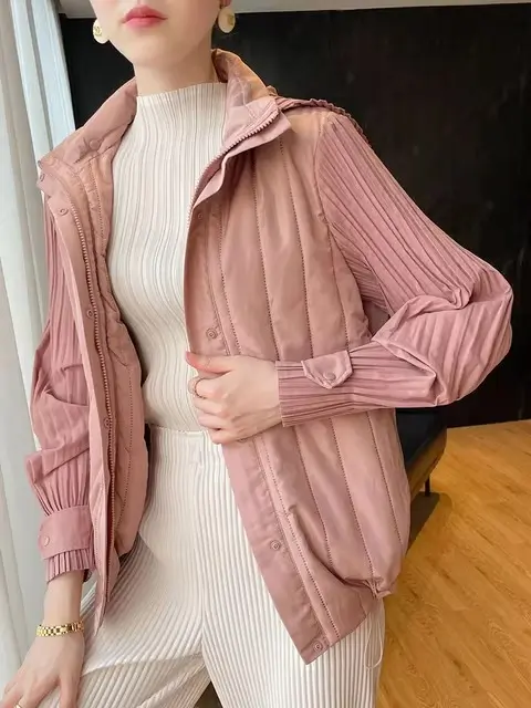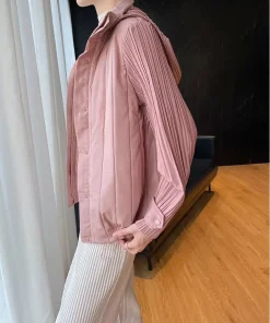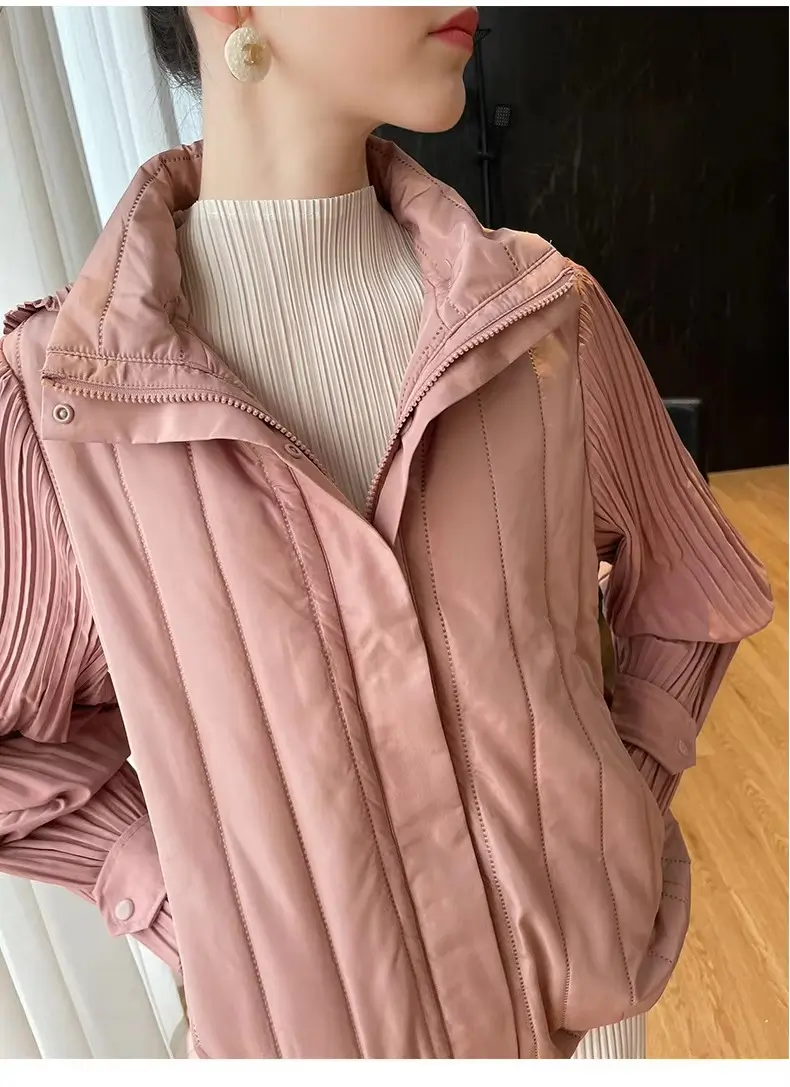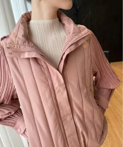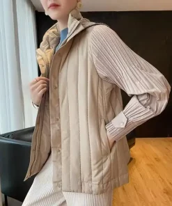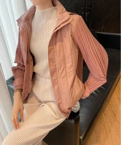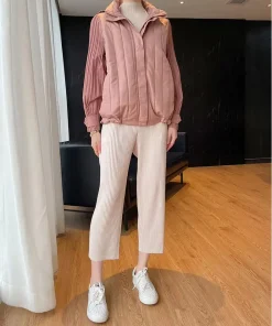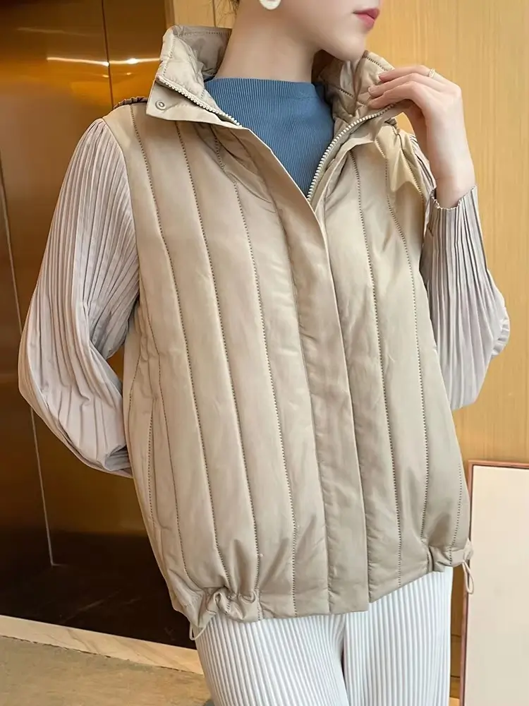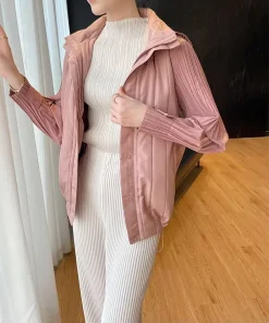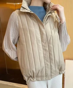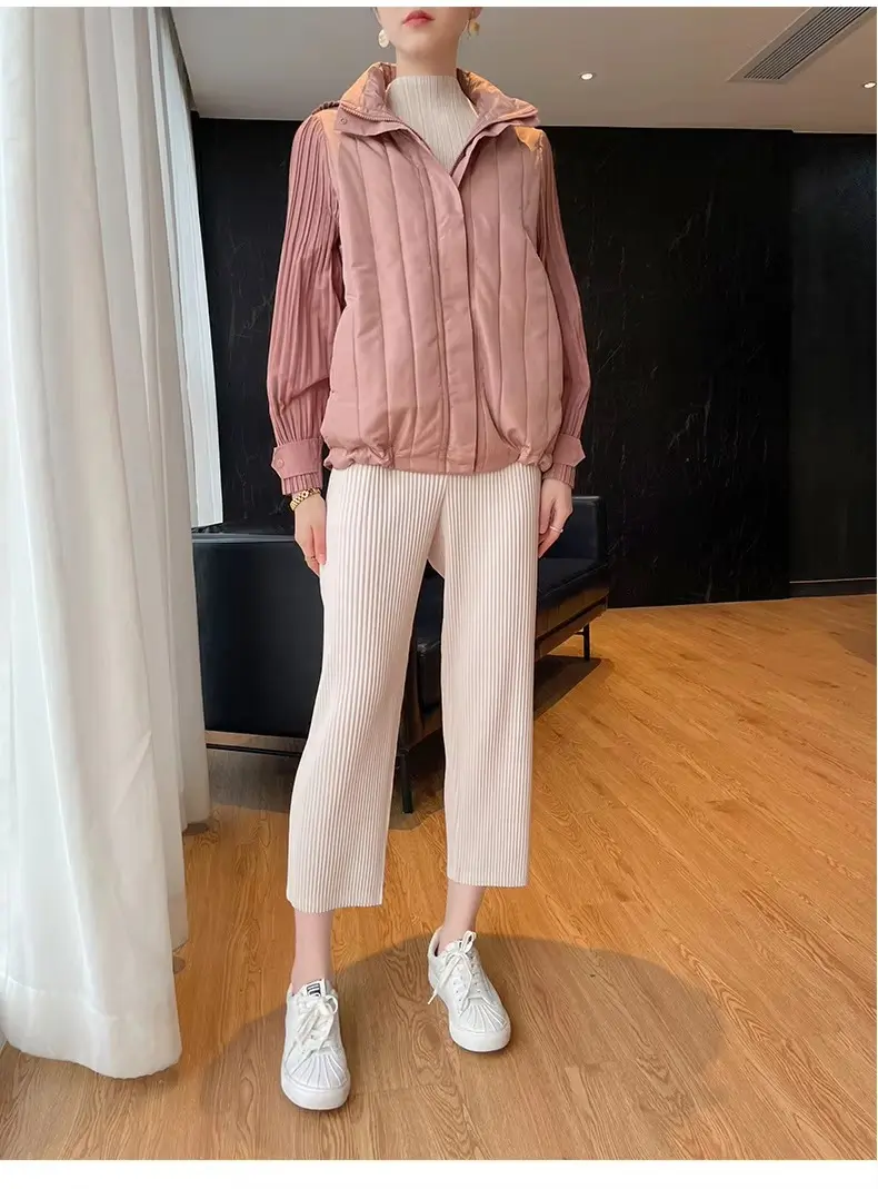 Elegant Pleated Hooded Zipper Solid Color Warm Versatile Full Sleeve Cotton Coat
